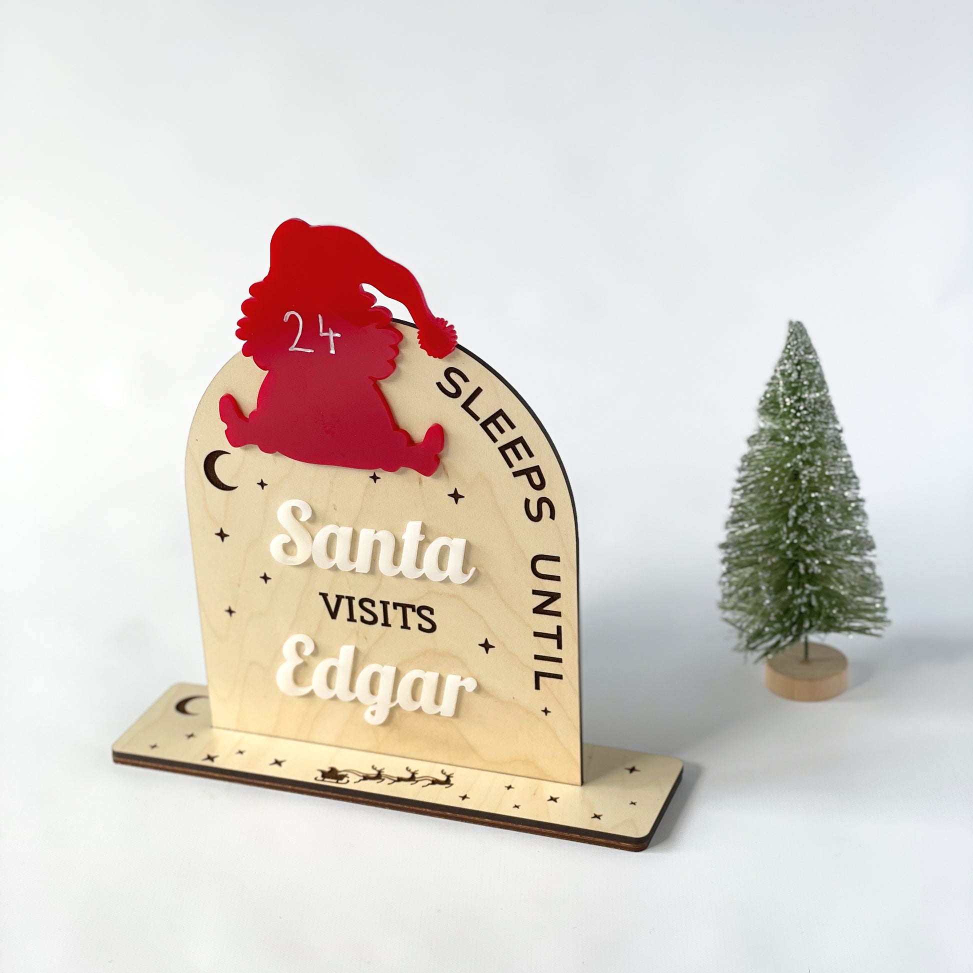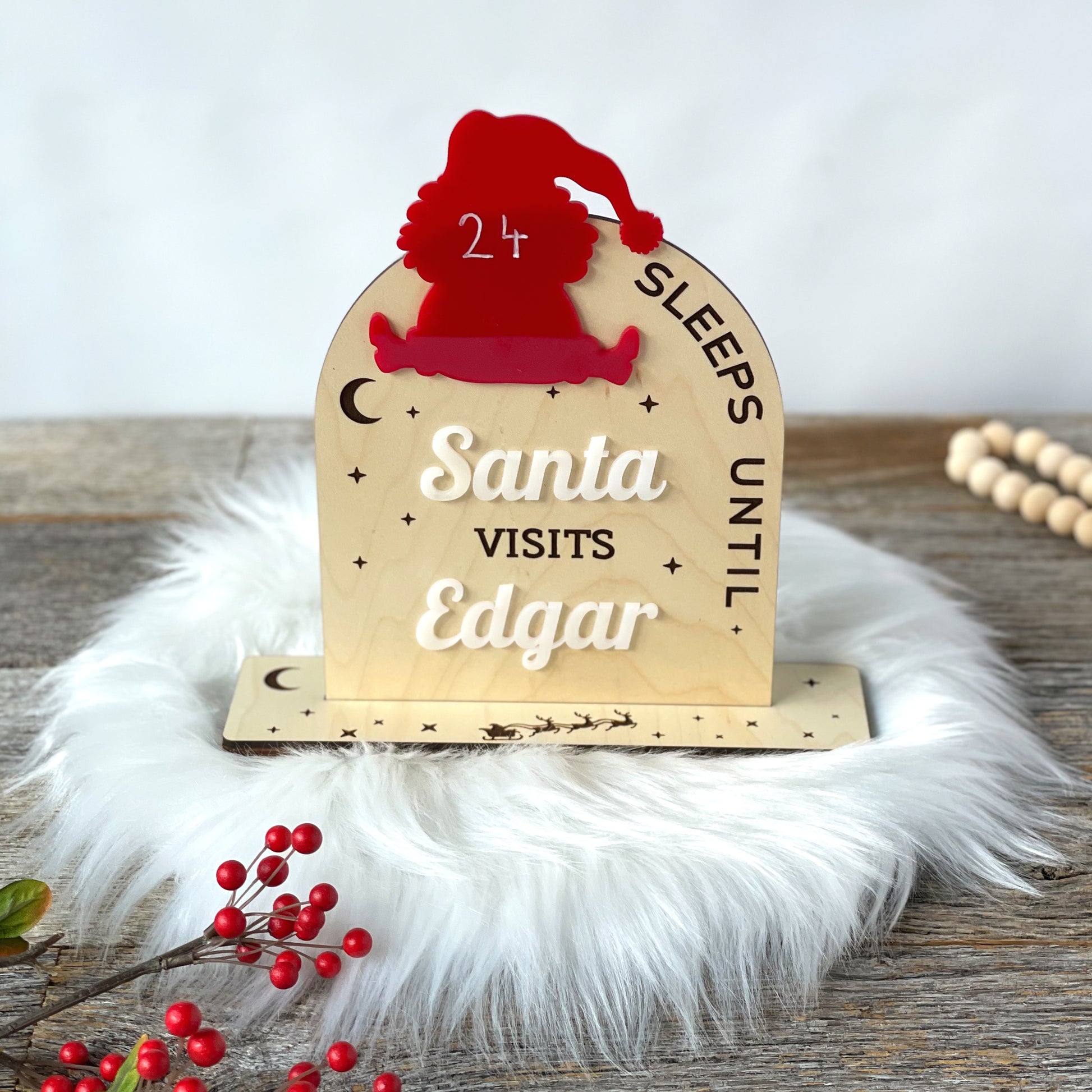 Presentamos nuestro letrero de Cuenta regresiva para la visita de Papá Noel: ¡una forma encantadora de contar los días hasta el momento mágico en que Papá Noel haga su alegre aparición! Los padres, abuelos o el niño pueden actualizar la cuenta regresiva con un bolígrafo de pintura acrílica blanca (opcional con su compra) en la vibrante silueta acrílica roja de Papá Noel. Personalice el letrero con el nombre de su hijo. El nombre de Papá Noel y de su hijo está cortado con láser en acrílico blanco.